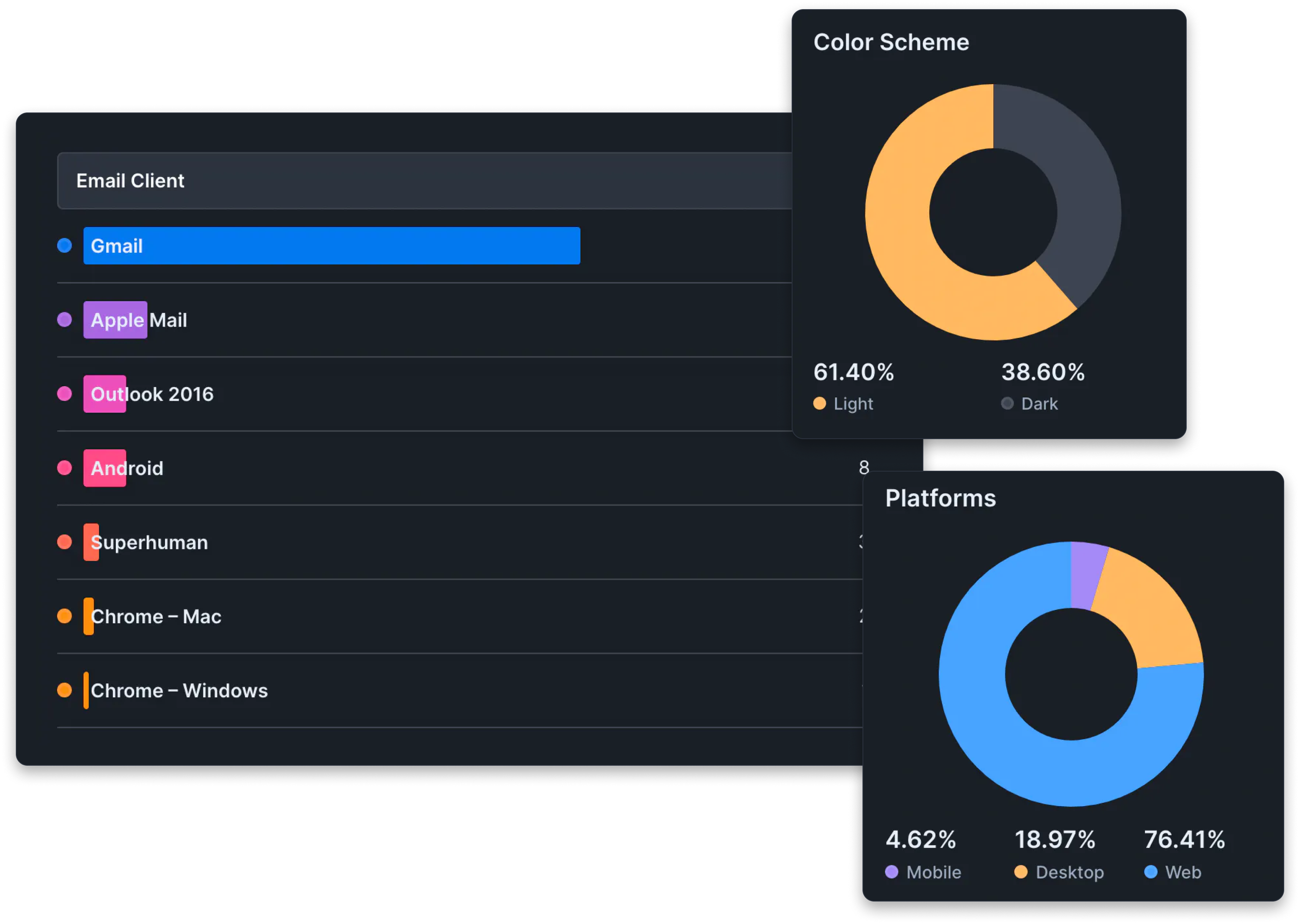 Enrich your marketing strategy. Get granular audience data, email client breakdowns, dark mode/light mode split, and answer your burning questions.