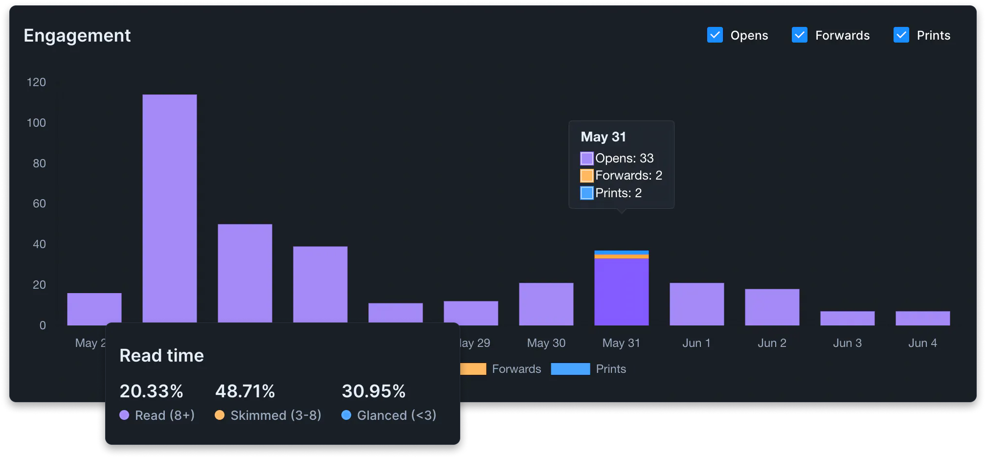 Shape your marketing strategy with actionable data. From audience details ranging from geolocation, read time, and email client breakdown, you can finally dig into questions like "is sending at 6 am ET too early?" and "do people read my emails?".
