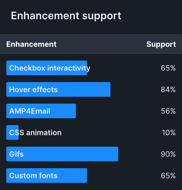 Every pixel comes with built-in detection for progressive enhancements. No more wondering which if you should include GIFs or if subscribers are seeing your fancy hover effects. We've got you covered with cold, hard data.
