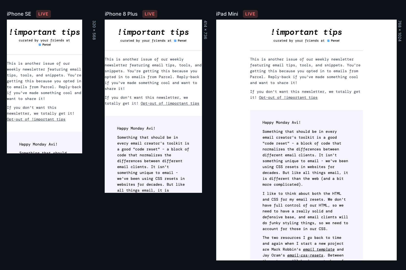 Tired of pinpointing all your email problems during QA? We all know how not-fun it can be to uncover multiple issues last-minute, Parcel saves you the trouble and allows you to debug live. Using Parcel's preview tools, you can expand table views and locate missing cells, block images, and remote CSS, and ensure your emails are handling dark mode too.